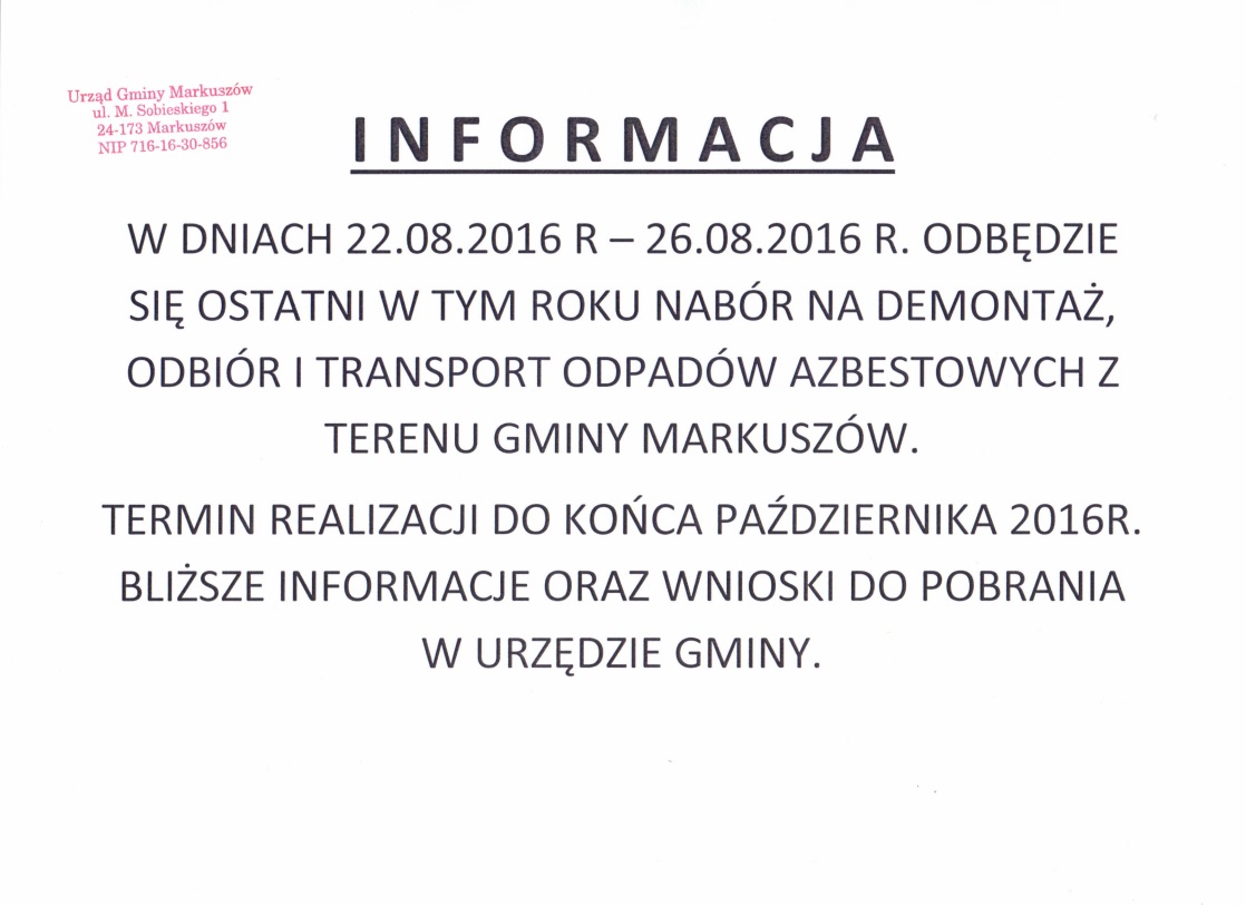 W dniach 18-29 marca 2016 roku odbędzie się nabór uzupełniający wniosków o udzielenie dofinansowania na pokrycie kosztów związanych z usuwaniem wyrobów zawierających azbest zlokalizowanych na dachach oraz posesjach. Wnioski są do pobrania w Urzędzie Gminy Markuszów pok. nr 4, tel. 81 8818072, lub ze strony www.azbest.lubelskie.pl