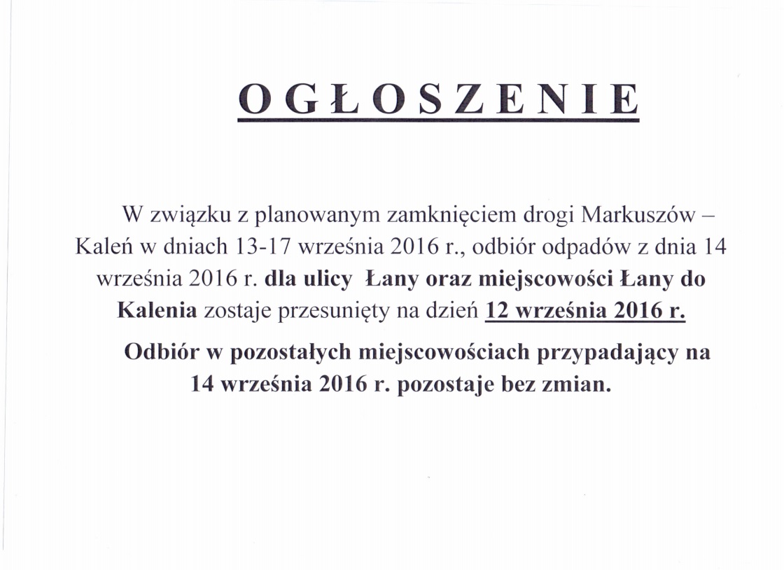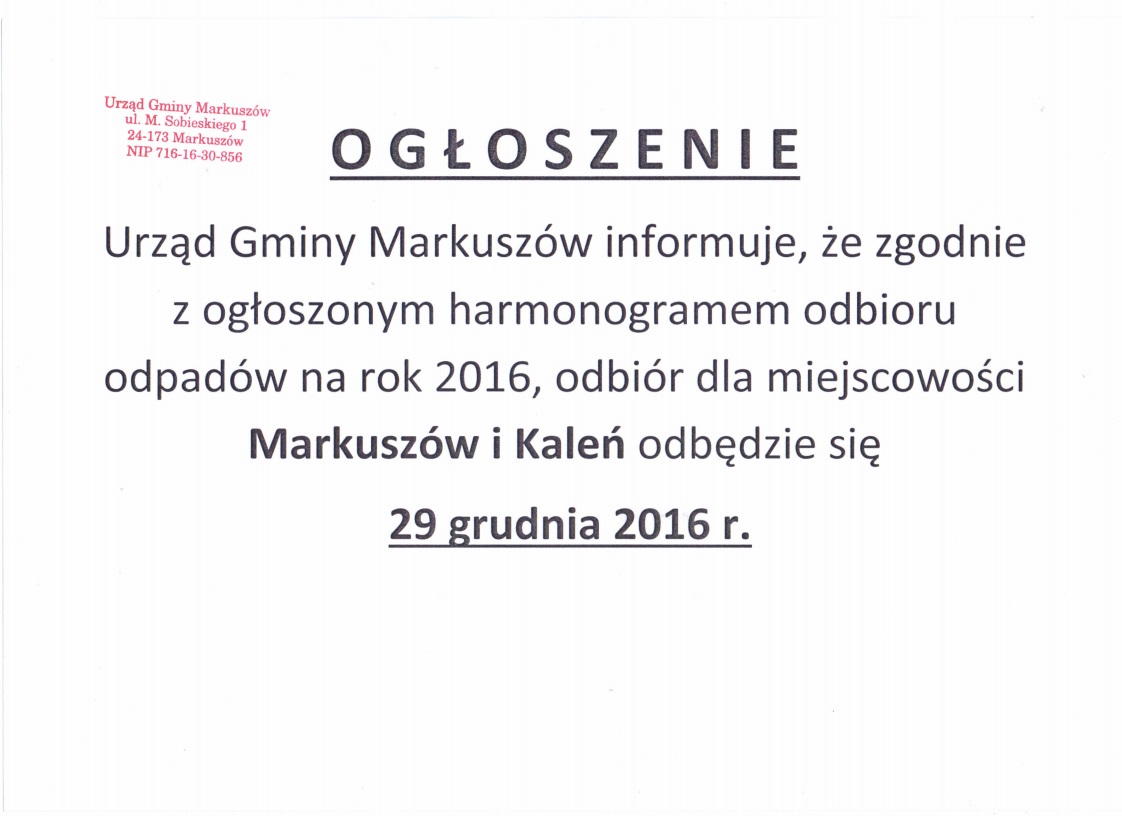 Odbiór odpadów z miejscowości Markuszów i Kaleń odbędzie się 28 grudnia.