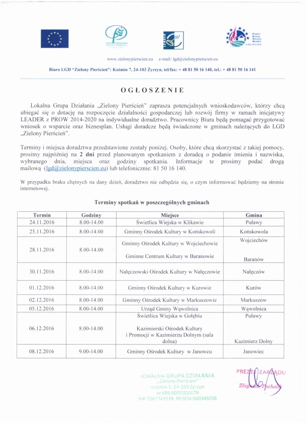 - Przygotowanie wniosków i doradztwo Biura LGD „Zielony Pierścień”