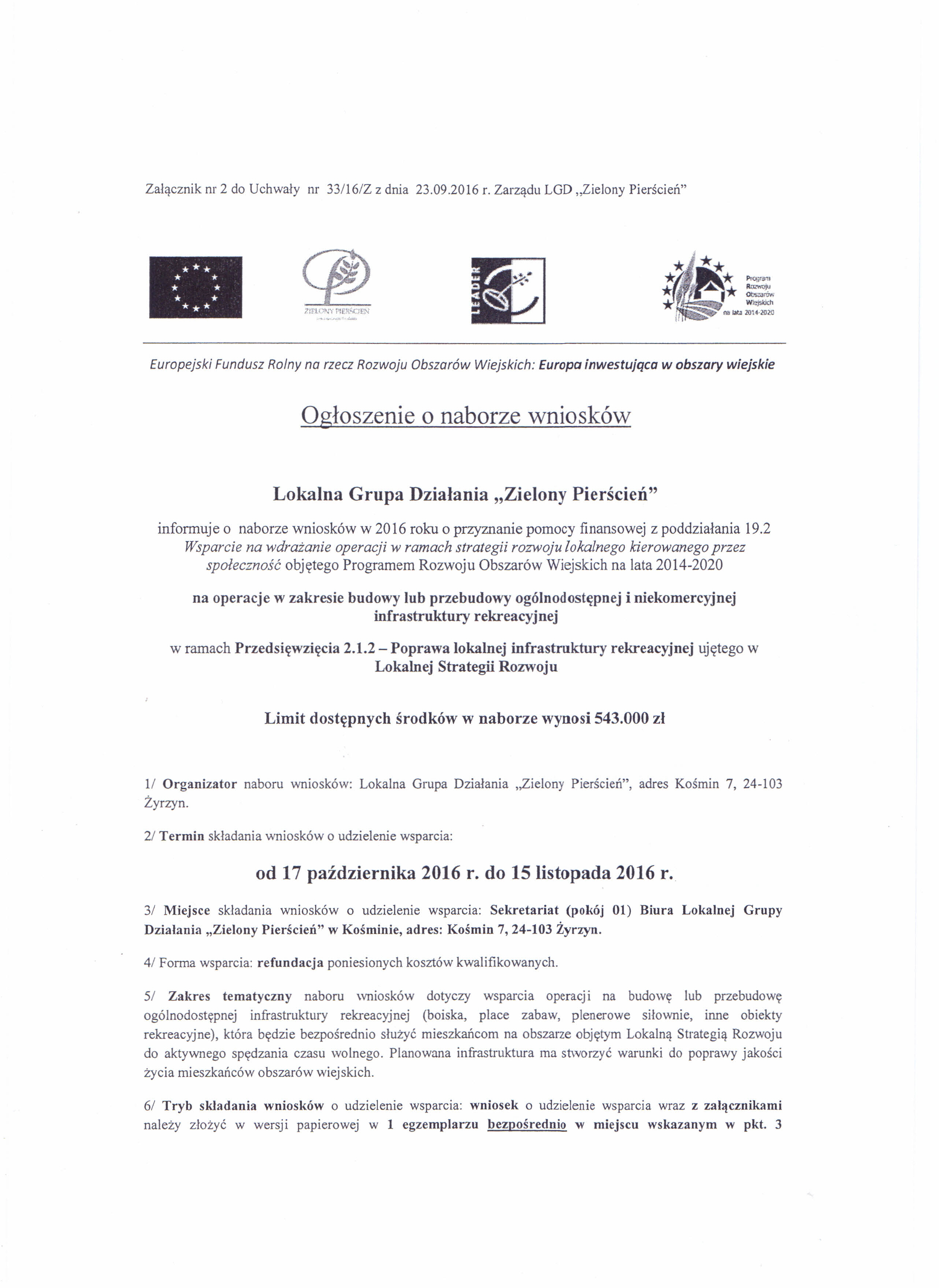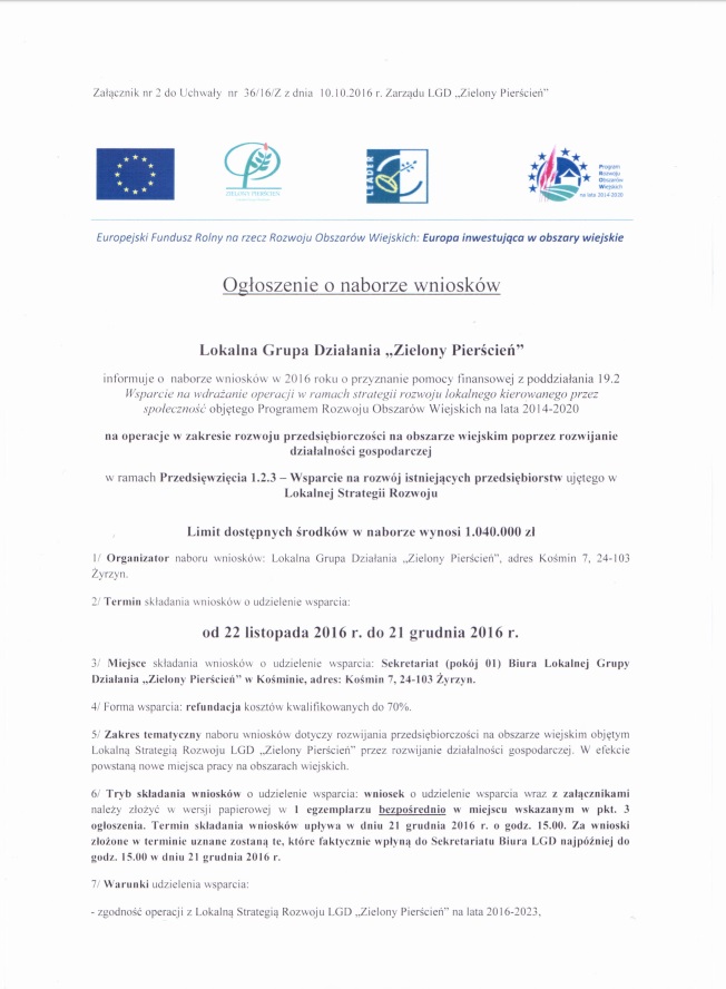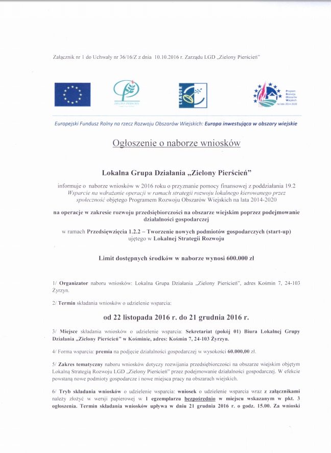 Lokalna Grupa Działania „Zielony Pierścień” uprzejmie zaprasza w dniach: 18 i 20 października 2016 r. na bezpłatne szkolenie pn. „Przygotowanie wniosku o przyznanie pomocy w zakresie rozwijania działalności gospodarczej w ramach inicjatywy LEADER z Programu Rozwoju Obszarów Wiejskich na lata 2014-2020”