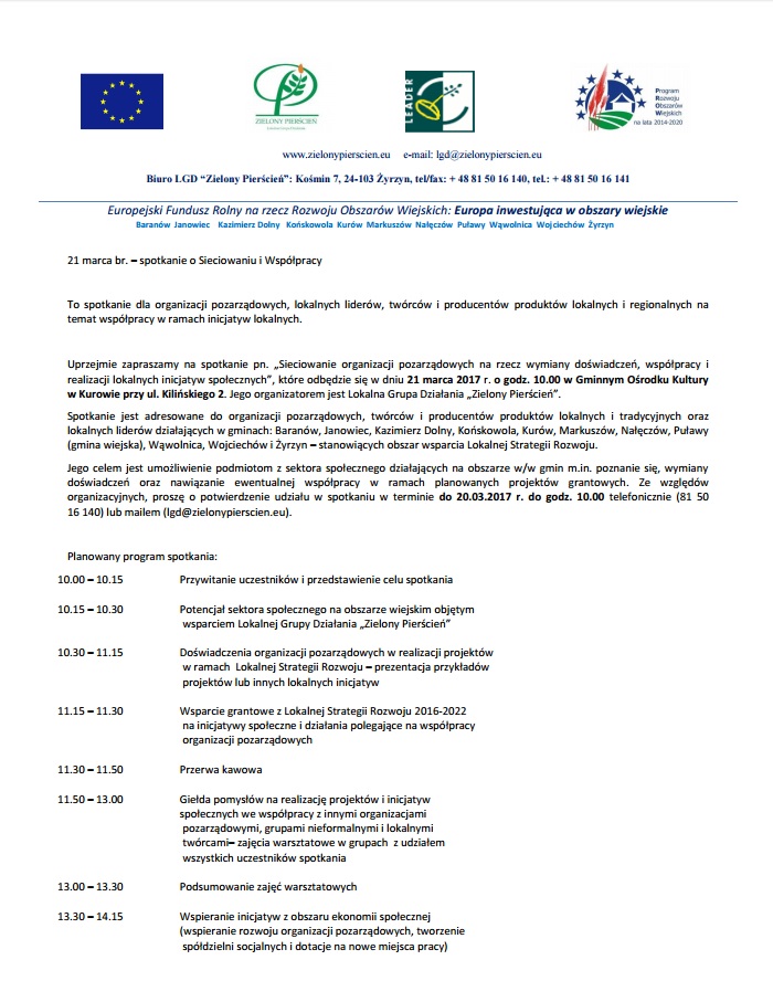 „Zarząd Lokalnej Grupy Działania „Zielony Pierścień” uprzejmie zaprasza na spotkanie informacyjne na temat wspierania rozwoju lokalnego na obszarach wiejskich (przedsiębiorczość, współpraca, integracja społeczna) z Lokalnej Strategii Rozwoju w ramach inicjatywy LEADER z Programu Rozwoju Obszarów Wiejskich 2014-2020. Spotkanie odbędzie się w dniu 9 czerwca br. o godz. 16.30 w Gminnym Domu Kultury (sala widowiskowa) przy ul. Sobieskiego 1 w Markuszowie.