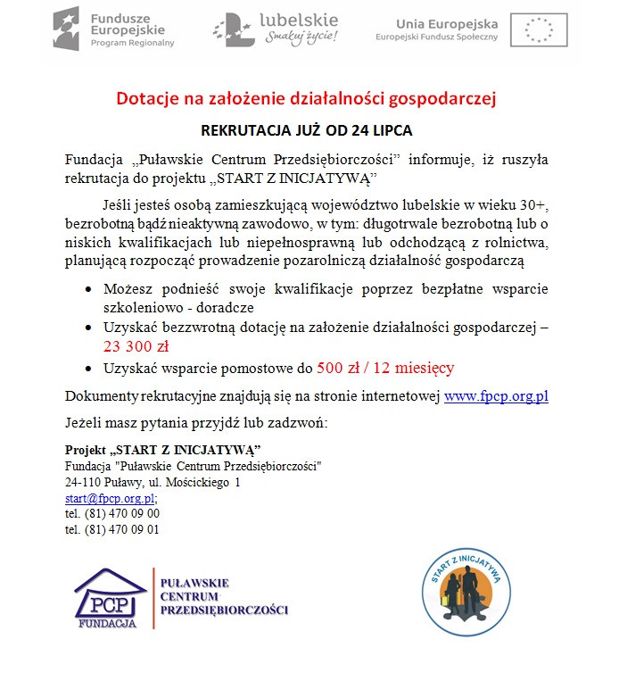 Fundacja Rozwoju Lubelszczyzny informuje, że w dniach od 17 do 28 lutego 2017 r. prowadzona będzie rekrutacja uczestników projektu „Pracuję u siebie”. Projekt zakłada udzielenie między innymi wsparcia finansowego (dotacji inwestycyjnej w kwocie 23 000 zł oraz wsparcia pomostowego w kwocie 8 400 zł) na rozpoczęcie prowadzenia pozarolniczej działalności gospodarczej.
